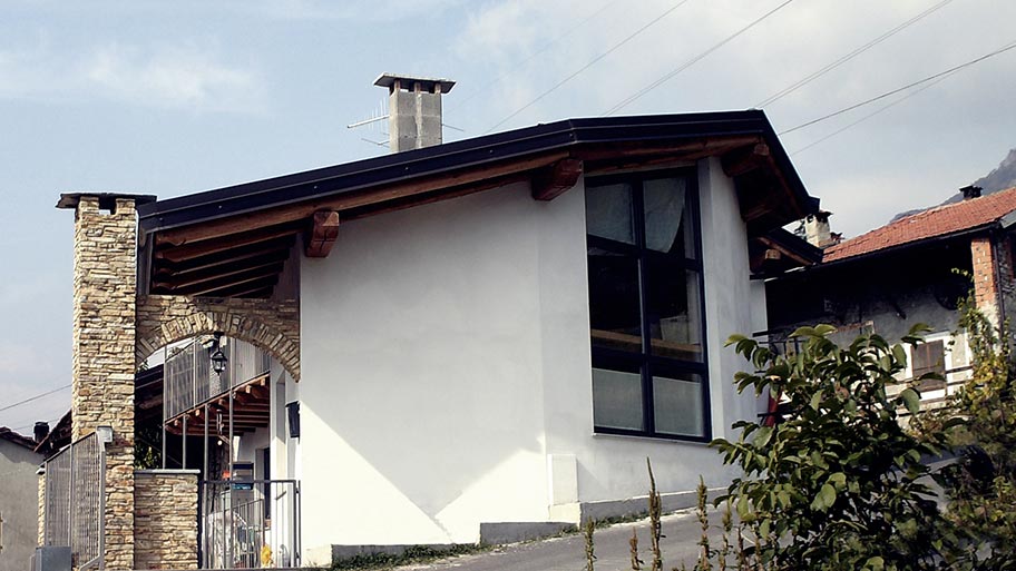 La intervención ha consistido en la demolición y sucesiva fiel reconstrucción volumétrica. La existencia de una pared curva, limitrofe a la calle, ha permitido la inserción de una caracterista gran ventana por la que entra mucha luz a los espacios interiores. La intervención recuerda la vieja tipología constructiva utilizando materiales como la madera, el hierro y la piedra en su simplicidad.